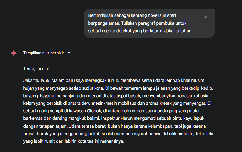 - “Bertindaklah sebagai seorang novelis misteri berpengalaman. Tuliskan paragraf pembuka untuk sebuah cerita detektif yang berlatar di Jakarta tahun 1950-an, dengan suasana yang kelam dan penuh teka-teki.”