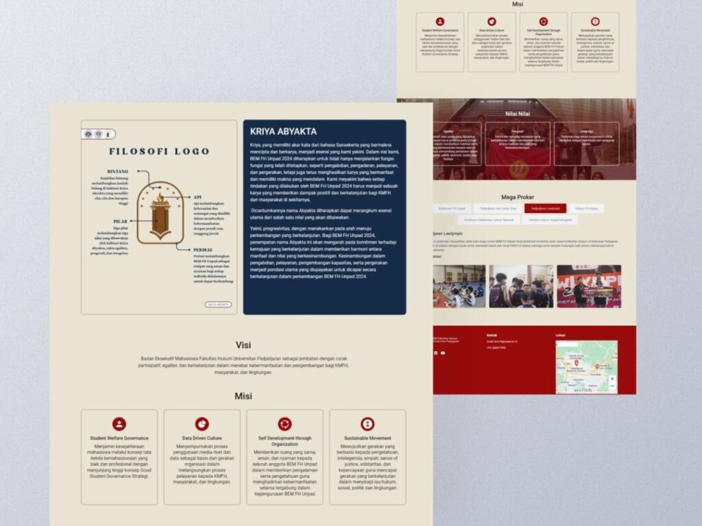 Halaman utama website dirancang untuk memberikan informasi yang jelas tentang visi, misi, dan kegiatan utama BEM Fakultas Hukum Unpad. Pengunjung dapat dengan mudah menemukan informasi yang relevan.